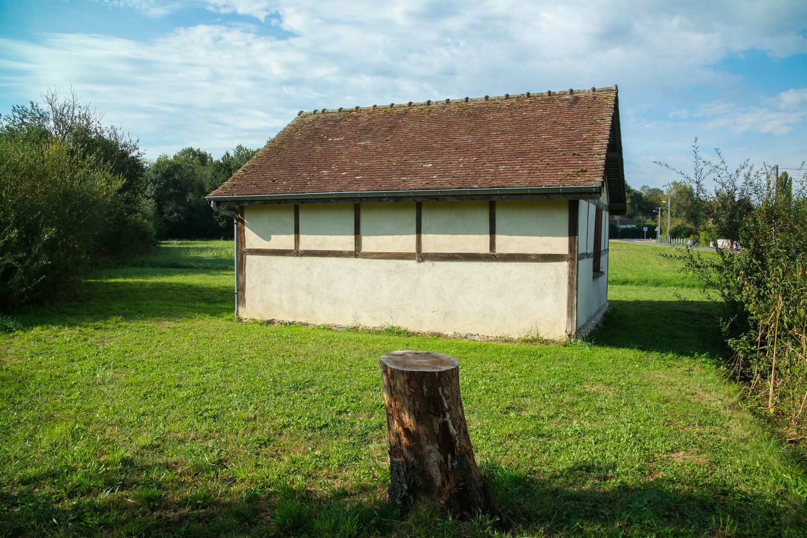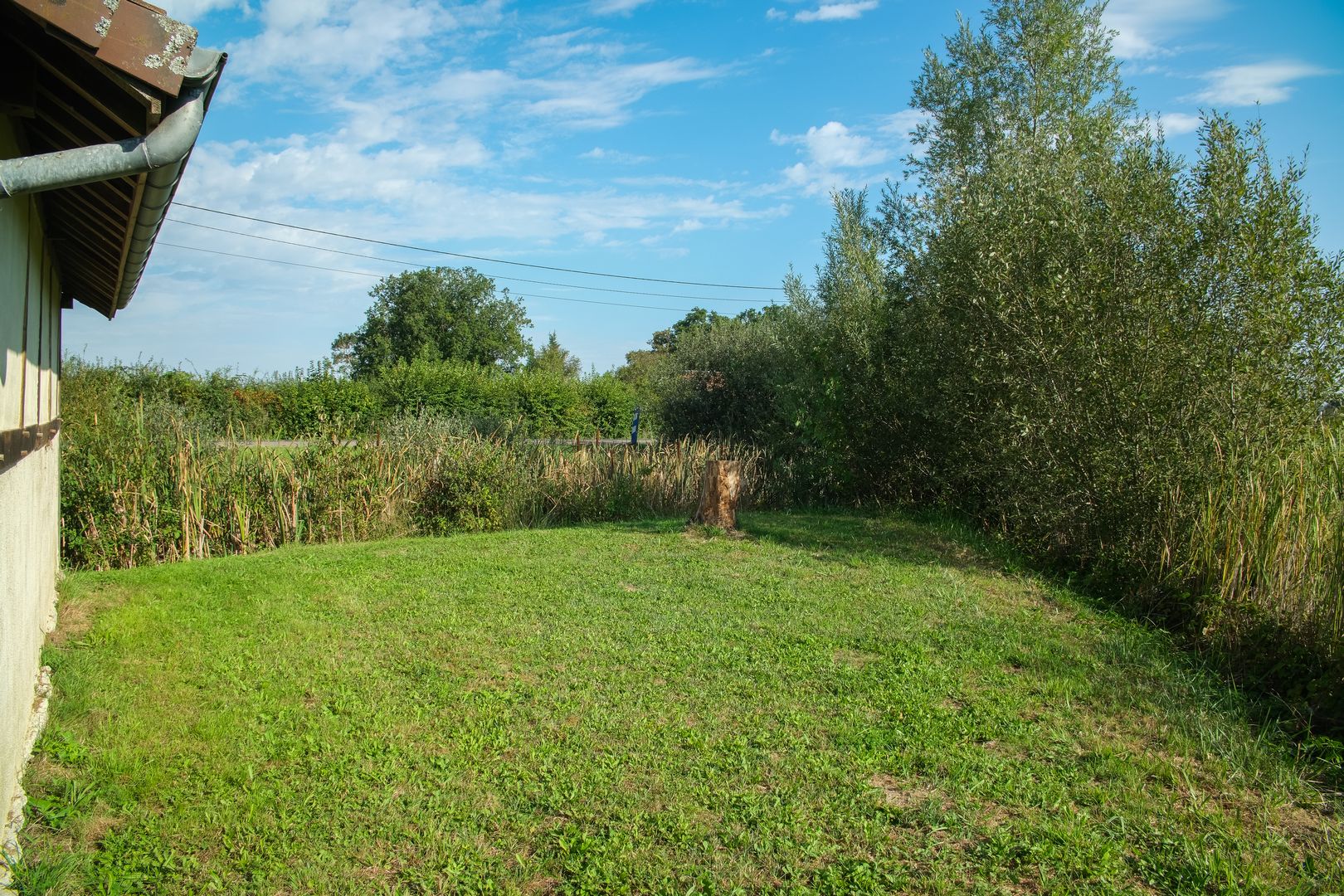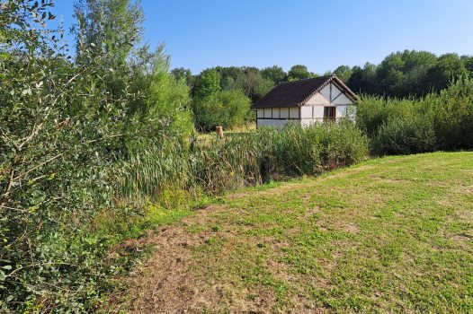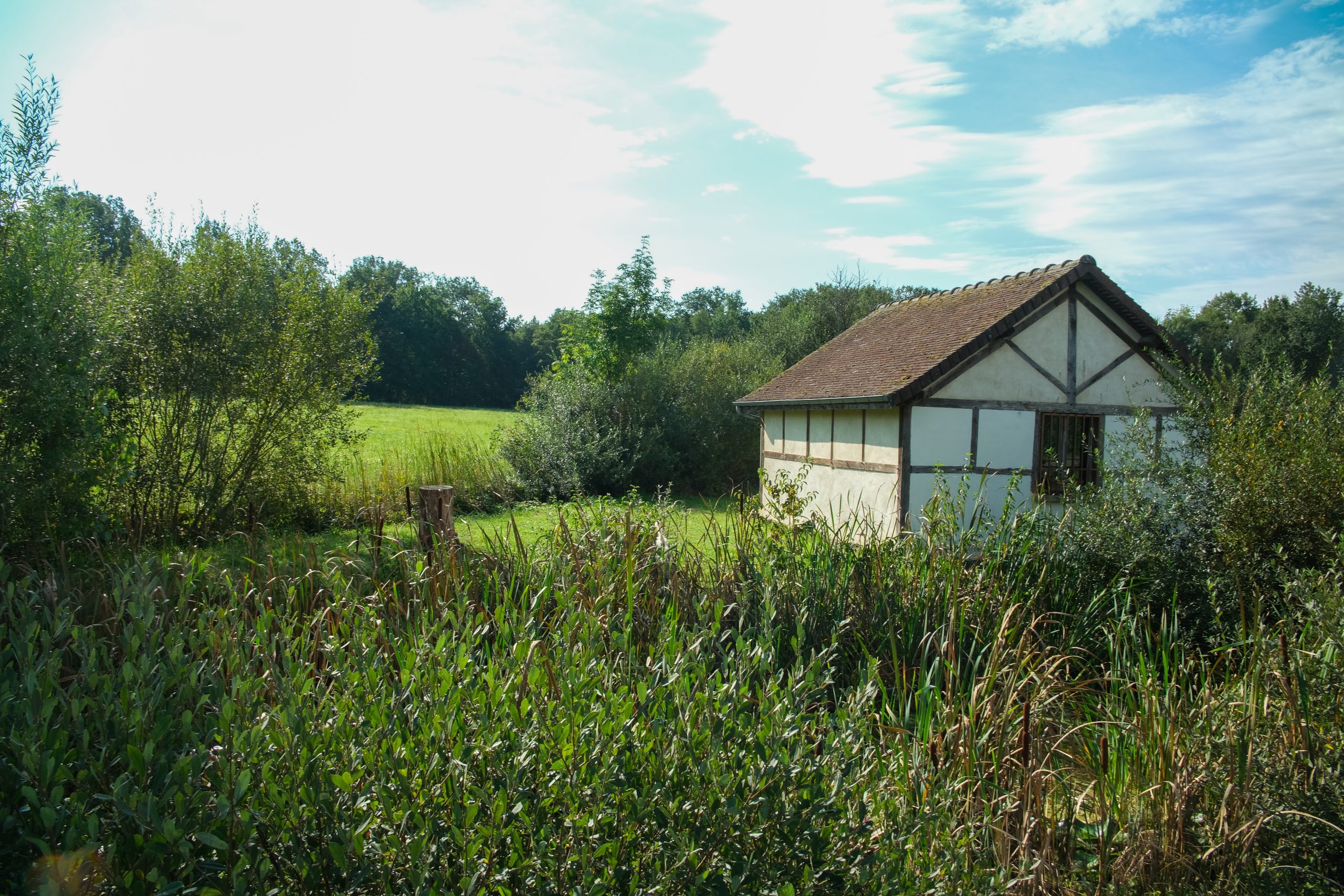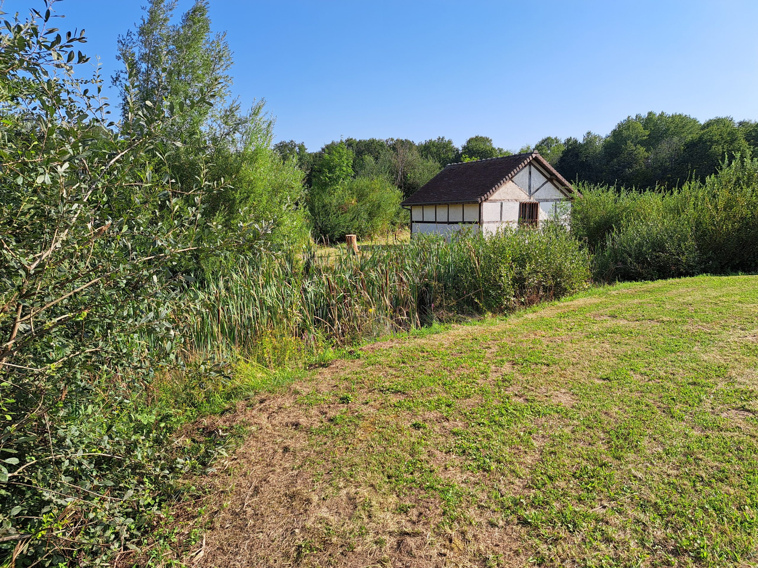 Herbe rase autour de la bâtisse, avec un terrain assez ferme. Une souche d’arbre visible à gauche suggère une gestion légère de l’espace naturel, sans artificialisation. En avant-plan, on observe une zone humide ou un étang bordé de roseaux et de joncs : sol potentiellement meuble ou marécageux à cet endroit. - Environnement :