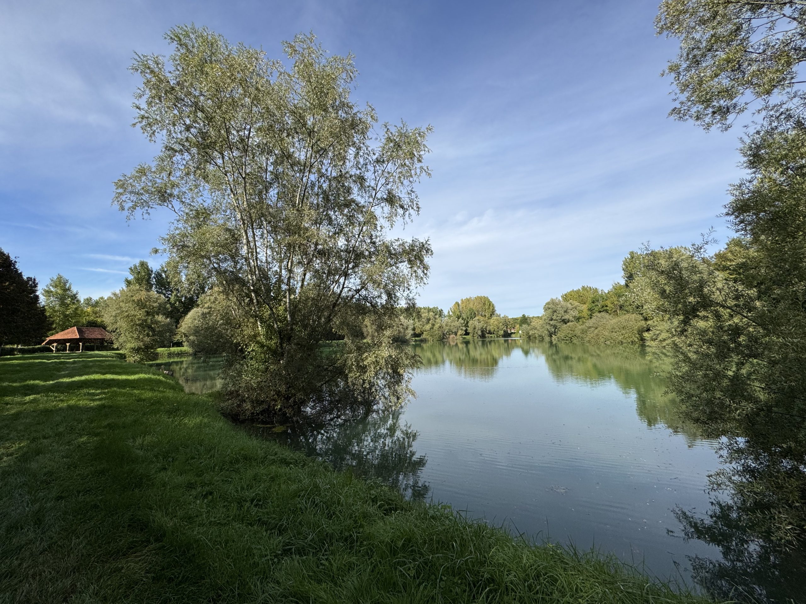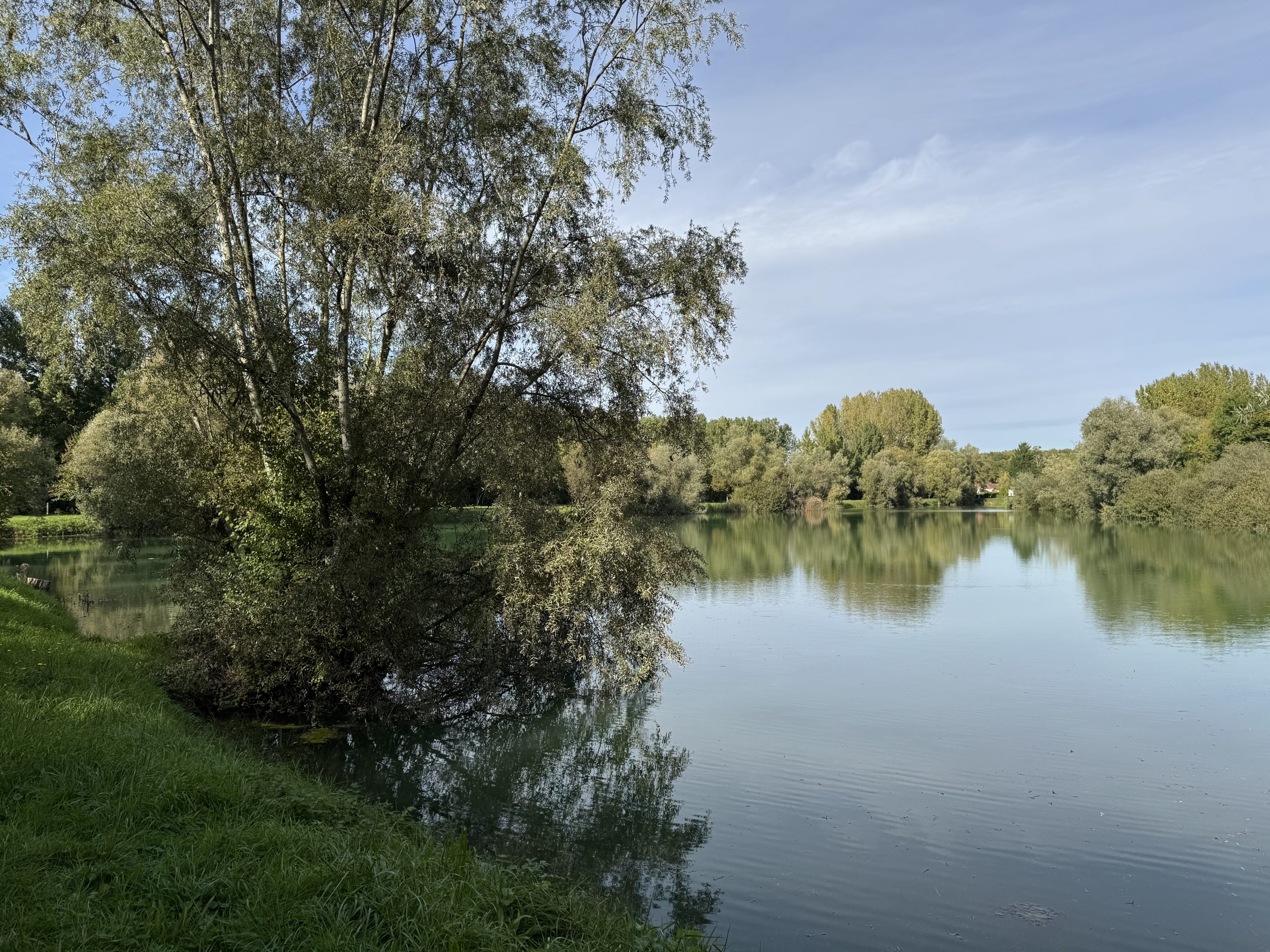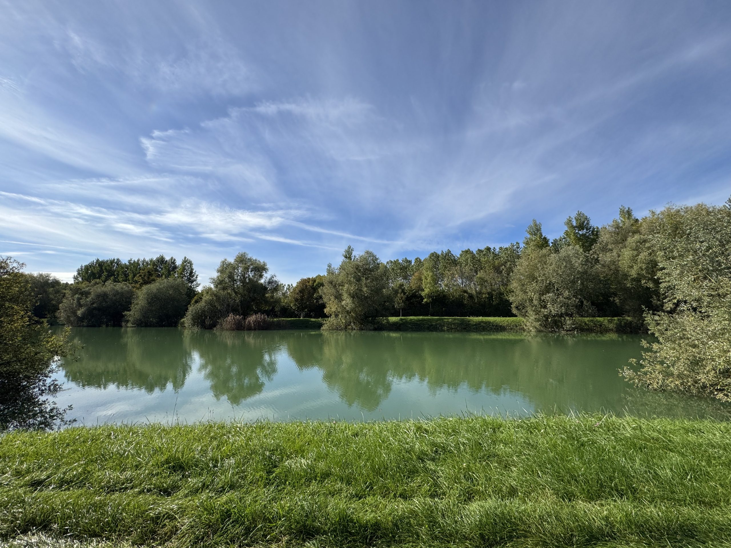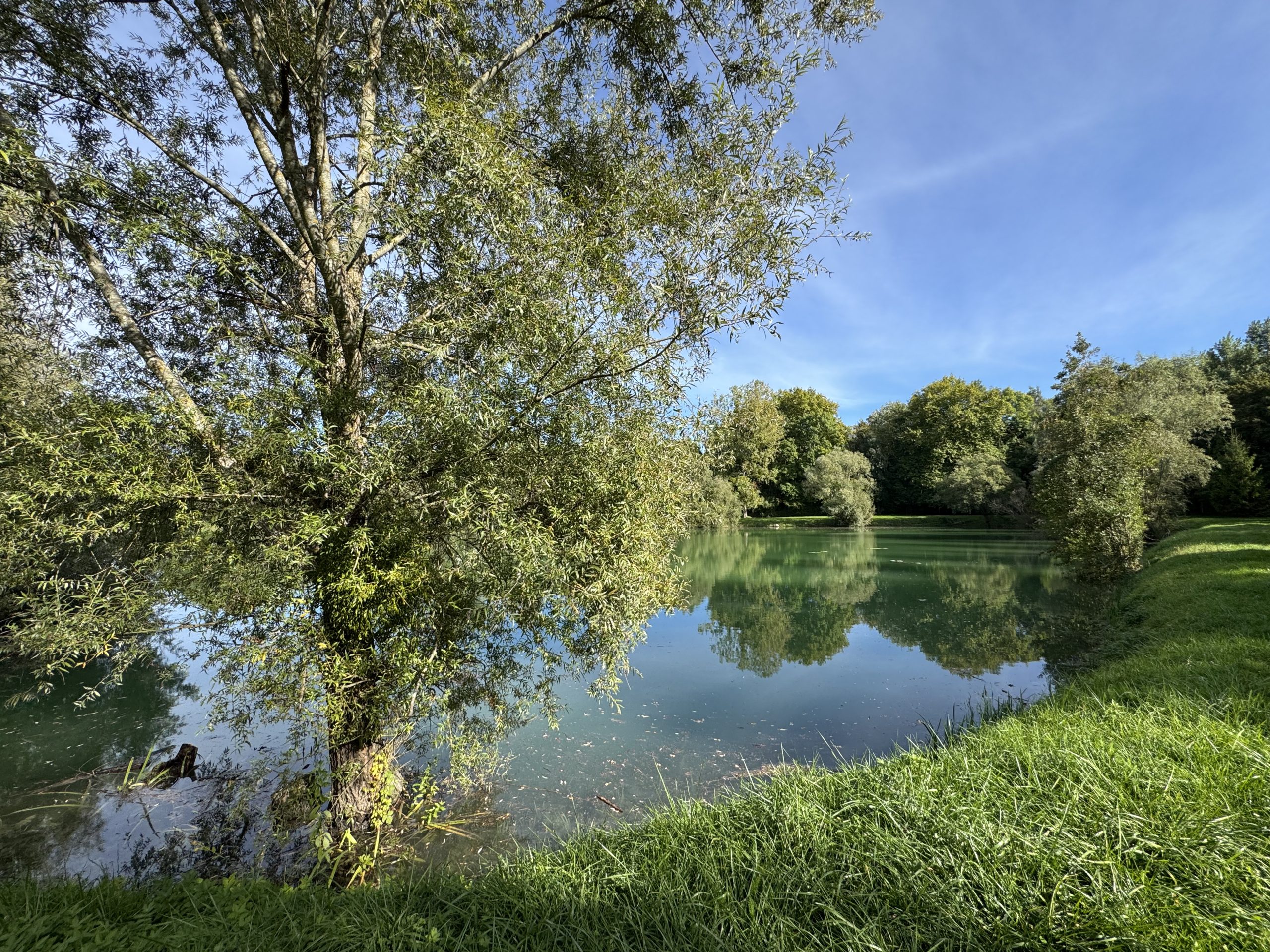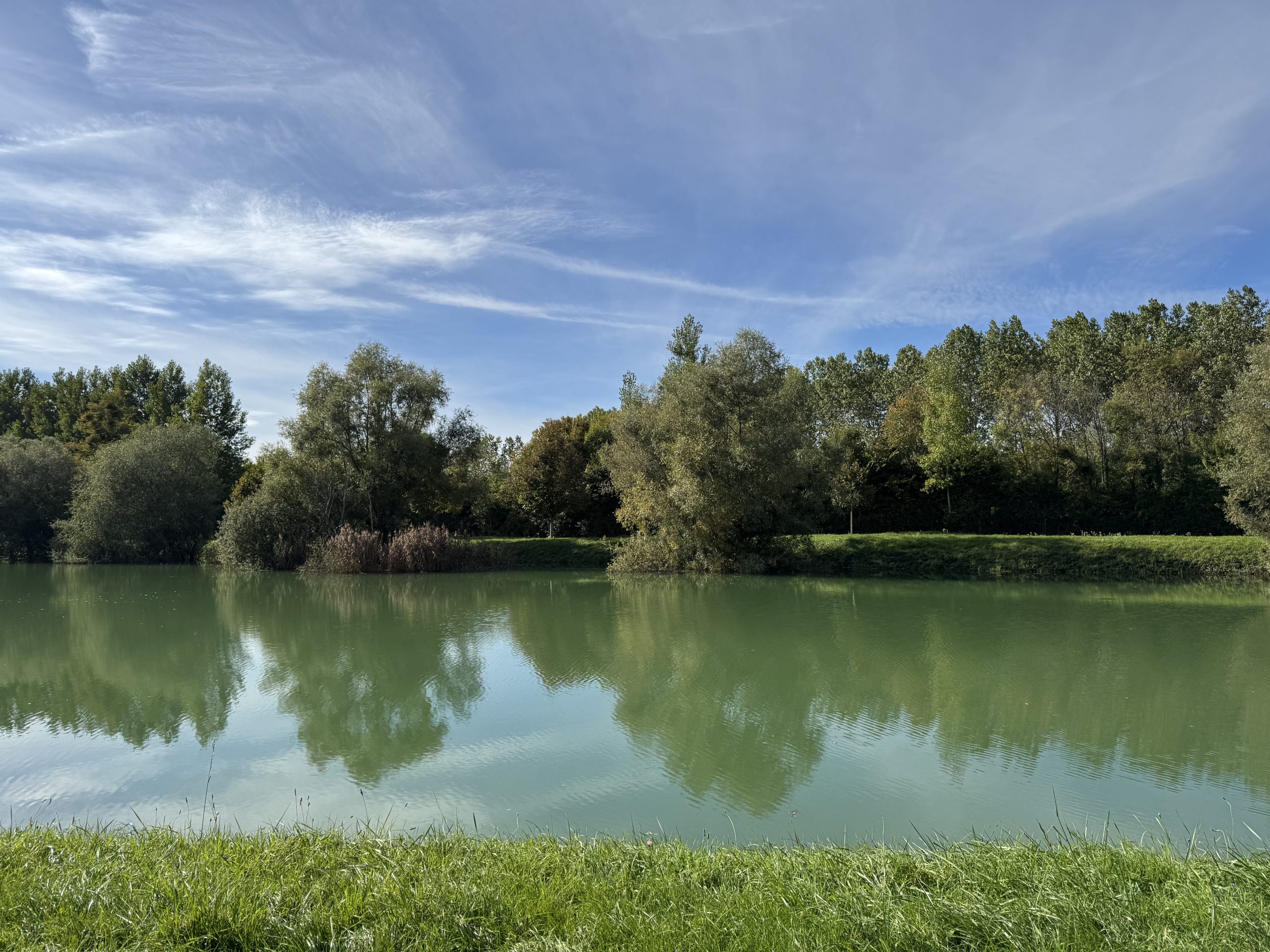 Le lieu est apaisant, presque contemplatif. Il s’agit d’un plan d’eau calme, bordé par une végétation dense et variée. La lumière naturelle se reflète sur la surface verte et miroitante de l’eau, créant des jeux subtils entre ciel, feuillages et reflets. Le silence y est dominant, seulement troublé par les sons discrets de la nature. L’ensemble dégage une atmosphère douce et presque méditative.